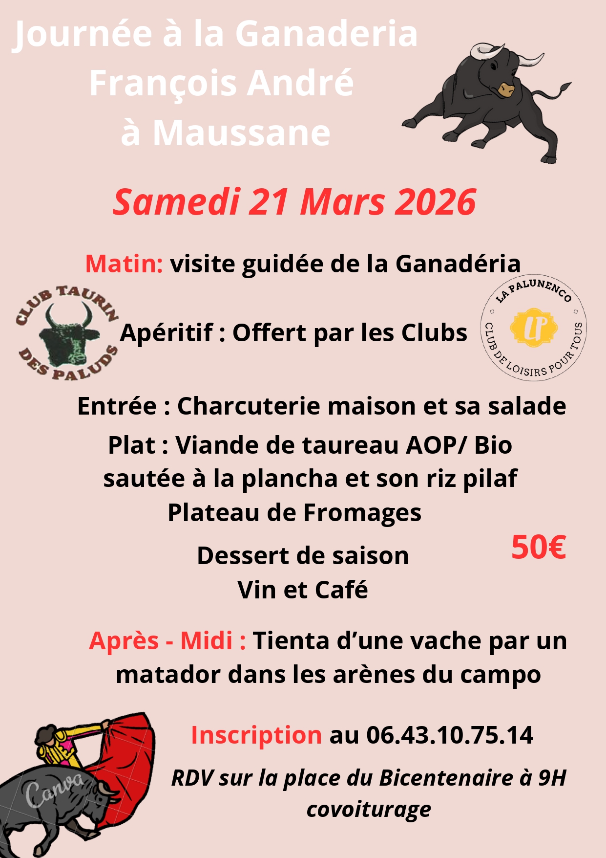 Journée à la Ganaderia François André à Maussane, organisée par le Club Taurin des Paluds et La Palunenco. Matin : visite guide de la Ganadéria. Apéritif offert par les clubs. Repas (charcuterie, viande de taureau riz, plateau de fromage, dessert, vin, café). Après-midi : tienta d’une vache par un matador dans les arènes du campo. 50€.