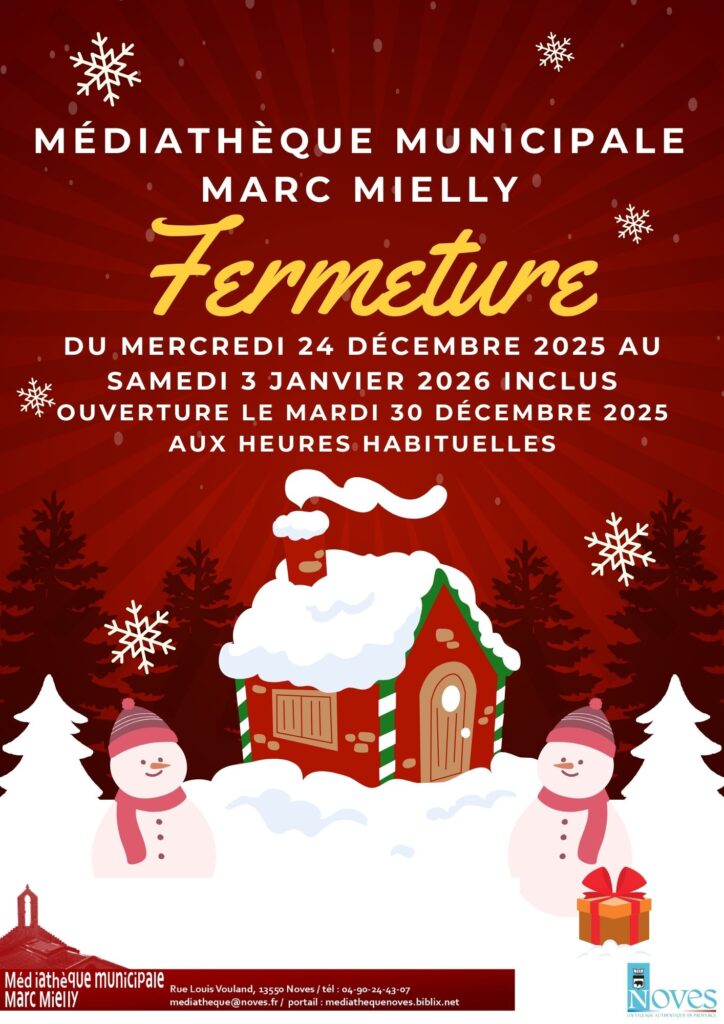 Horaires d’ouverture durant les fêtes / Médiathèque Blandine2025-12-18T15:43:34+01:0018 décembre 2025|Actualités, Médiathèque municipale| Partagez cet article FacebookXLinkedInPinterestEmail Articles similaires Avis de concertation – Révision allégée n°1 du P.L.U. Horaires d’ouverture durant les fêtes / Noves Infos Tourisme Collecte des sapins de Noël usagés 3ème Fleur